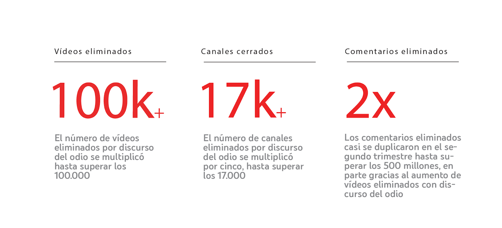 Por ejemplo, los casi 30.000 vídeos que eliminamos por discurso del odio durante el último mes han generado solo un 3% de las visitas que obtuvieron, por ejemplo, los vídeos de calceta en el mismo periodo.