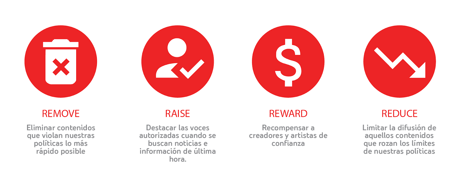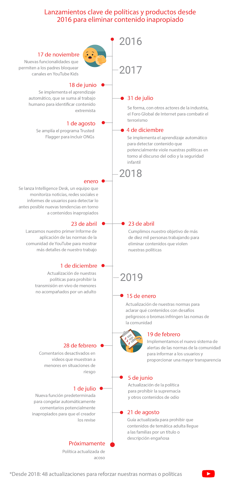 Antes de eliminar cualquier contenido que viole nuestras políticas, tenemos que asegurarnos de que la línea que separa aquello que eliminamos de lo que permitimos se encuentra en el lugar correcto, con el objetivo de preservar la libertad de expresión al tiempo que protegemos nuestra comunidad. Para ello, contamos con un equipo dedicado al desarrollo de nuestras políticas que las revisa sistemáticamente para asegurarnos de que están actualizadas, de que preservan la seguridad de la comunidad y garantizan la apertura de YouTube.