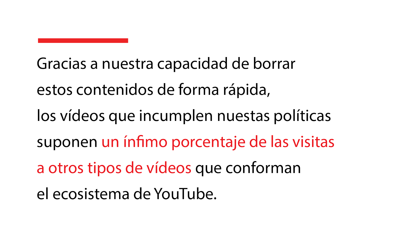 Estamos decididos a continuar reduciendo la exposición a vídeos que transgredan nuestras políticas. Es por eso que, en Google, tenemos a más de 10.000 personas encargadas de detectar, revisar y eliminar contenidos que violan nuestras normas. Gracias a nuestra capacidad de borrar estos contenidos de forma rápida, los vídeos que incumplen nuestras políticas suponen un ínfimo porcentaje de las visitas a otros tipos de vídeos que conforman el ecosistema de YouTube