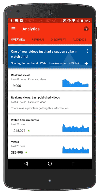 ¿Se ha producido un aumento repentino de las visualizaciones de uno de tus videos? Gracias a nuestras nuevas herramientas de análisis de datos, recibirás un mensaje personalizado cada vez que suceda algo significativo en tu canal, además de consejos sobre cómo sacar el máximo provecho de tu actividad.